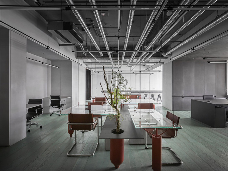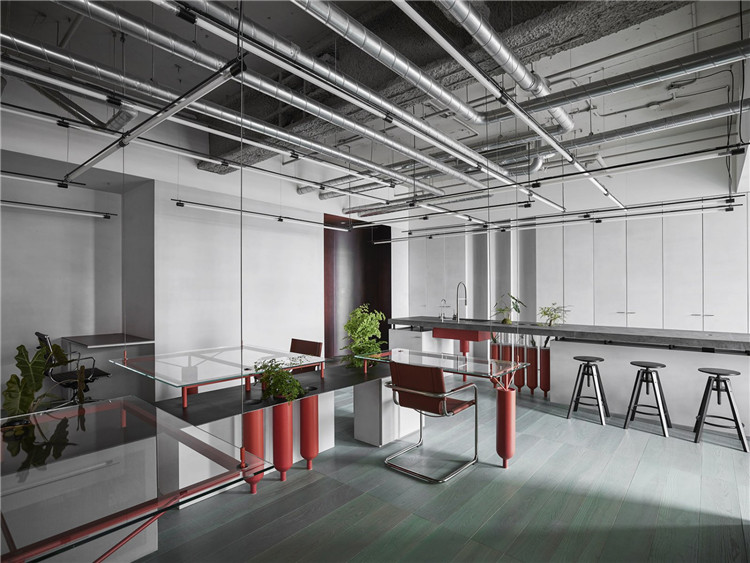 當(dāng)靈感關(guān)鍵抓緊"科學(xué)"而非"辦公室",設(shè)計師希望強(qiáng)化產(chǎn)業(yè)屬性里的科學(xué)基底,扭轉(zhuǎn)一般人對辦公室的刻板藍(lán)圖.回歸產(chǎn)品本身最貼近的實驗室、工廠環(huán)境,日日可見的試管、生鐵黑鐵、氣體輸送管,以及包裝承載科技?xì)怏w的獨特鋼瓶,擷取生產(chǎn)鏈上再熟悉不過的材質(zhì)與造型,拆解轉(zhuǎn)換成辦公空間的結(jié)構(gòu)形體.
