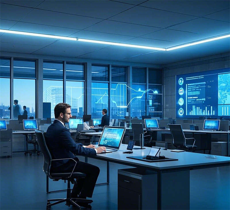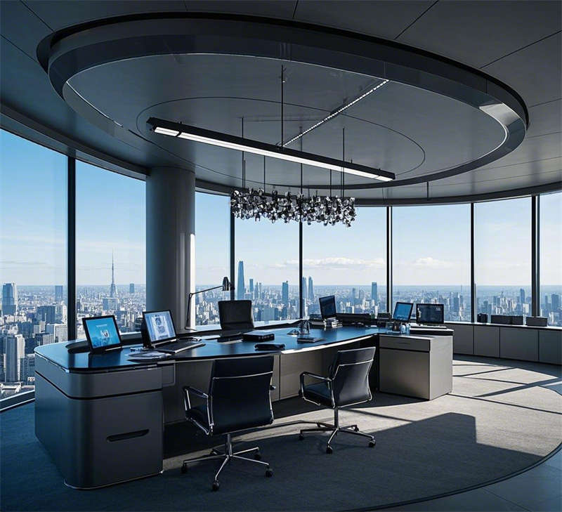 前臺接待室以懸浮式前臺和全息投影動態(tài)logo為核心,金屬質(zhì)感墻面與燈光效果結(jié)合,營造出未來之門的第一印象。敞開式辦公室通過數(shù)據(jù)流全息屏幕和智能辦公桌,打造高效協(xié)作的數(shù)字化辦公環(huán)境。經(jīng)理辦公室采用全景落地窗和智能辦公系統(tǒng),簡約大氣,兼顧商務(wù)與舒適。總裁辦公室位于頂層,全景視野與奢華材質(zhì)相得益彰,藝術(shù)裝置彰顯領(lǐng)導風范。