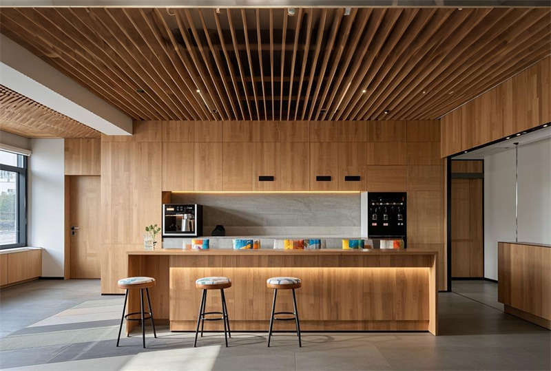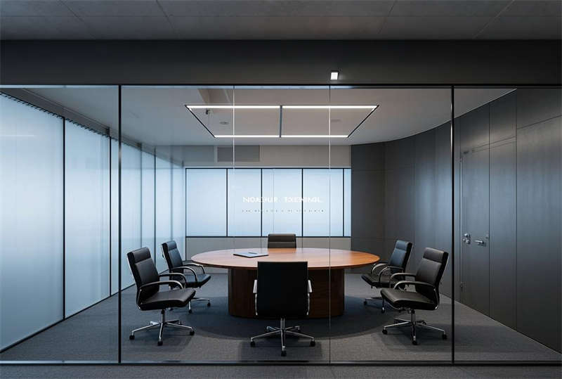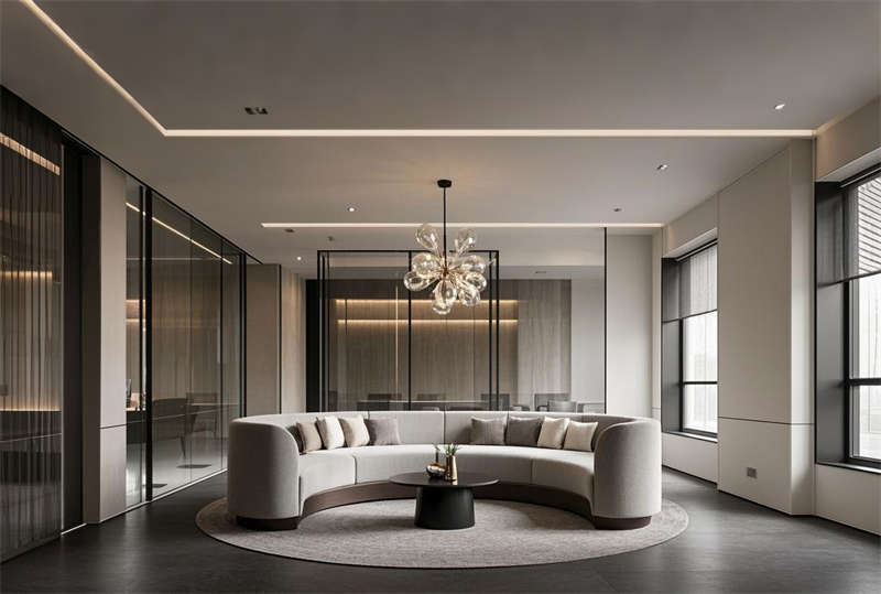 本方案采用現代簡約設計語言,整體空間以淺灰、白、原木三色為主基調。前臺區設置懸浮式接待臺與發光LOGO墻,搭配LED線性照明塑造企業形象。開放式辦公區采用模塊化工位布局,通過玻璃隔斷劃分功能區域,保證自然采光最大化的同時提升空間通透感。智能會議系統集成于各會議室,配備電動投影和書寫玻璃墻。經理室采用深藍色烤漆木飾面提升商務質感,休息區設置咖啡吧與卡座強化員工關懷。走廊運用導視燈帶串聯各區域,茶水間六角地磚增添趣味性。培訓室階梯式布局配合吸音墻面確保聲學效果,電話間磨砂玻璃立方體兼顧隱私與采光。VIP室智能霧化玻璃實現空間靈活轉換,整體設計注重功能分區與人文關懷的平衡。