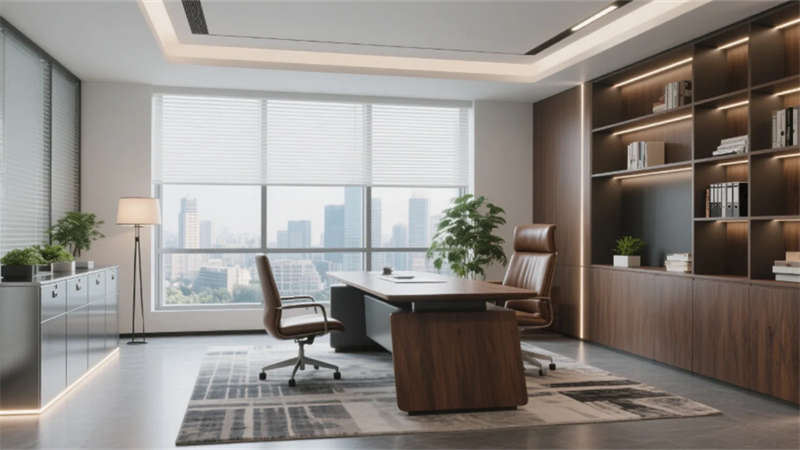 從前臺懸浮木紋臺面的企業標識,到開放式工位可變的模塊化組合,空間始終保持著“未完成”的進化基因。頭腦風暴區的可書寫玻璃墻記錄著思維軌跡,階梯培訓區的滑軌電源系統隨需求生長,智能會議室霧化玻璃在透明與私密間自由切換,專注電話艙的磨砂質感包裹著獨立思考的靜謐。高管辦公室的皮質座椅與垂直線條燈帶,隱喻著決策的柔韌與果決,而咖啡區黑板墻的手繪痕跡,則讓機械齒輪般的空間有了呼吸的節奏。