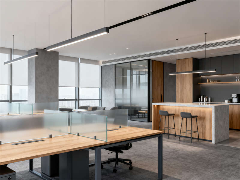 開放辦公區(qū)以通透協(xié)作為設(shè)計重點,半透明磨砂玻璃隔板兼顧隱私與互動,木色桌面與深灰金屬支架結(jié)合,延續(xù)整體材質(zhì)基調(diào),搭配簡約照明,營造專注且不壓抑的工作氛圍。獨立辦公室劃分出辦公與接待區(qū)域,木飾面背景墻搭配淺灰布藝沙發(fā),在保持商務(wù)感的同時,增添柔和質(zhì)感,滿足私密溝通需求。