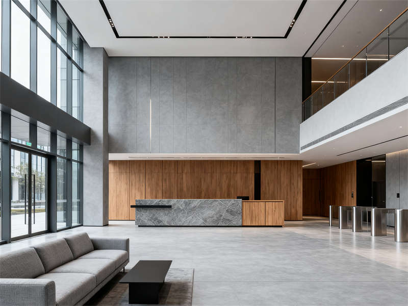 入口大堂以開闊格局為核心,淺灰地磚搭配低飽和木色前臺,弱化厚重感的同時,用金屬線條勾勒細節(jié),讓第一印象既專業(yè)又通透。玻璃隔斷貫穿多個區(qū)域,在走廊處搭配木色門牌,既保證采光,又通過材質(zhì)呼應(yīng)強化整體感,避免空間割裂。