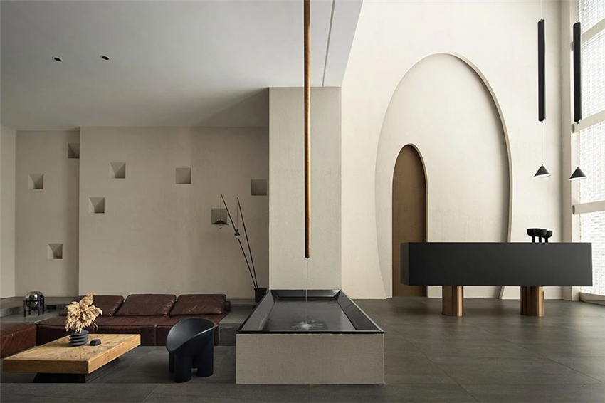 中性的色彩美學(xué)為基調(diào),無彩色與暖調(diào)的咖色相互補充,一抹深色,使空間靜默下來,將溫柔緩緩釋放。柔涓的水流墜落在水面上,蕩起一圈小渦,我們喜歡這種流動性,有種輕盈的感覺。