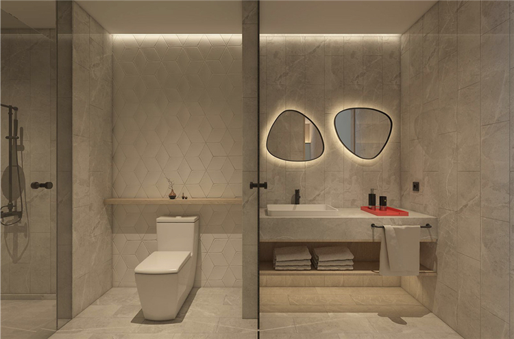 設計師遵循原有的管道設計,通過半堵實用的功能墻,將洗浴間和馬桶間劃分,在隱形了五金件和儲物歸納后,化繁為簡被得到了充分的運用,就連回風口也被巧妙的融入在燈帶里.