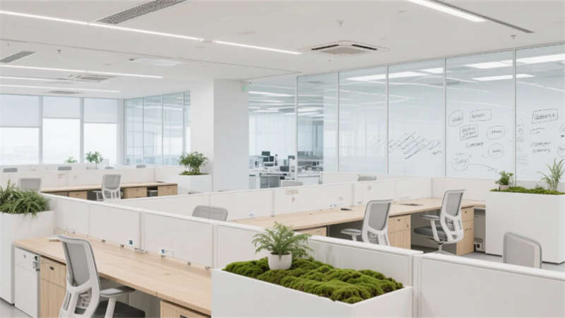 步入其中,純凈的白色與淺灰基調構筑出開闊明亮的基底,大面積玻璃幕墻邀請陽光自由流淌。室內,垂直綠墻與蔥郁盆栽如音符般跳躍,為嚴謹的研發環境注入蓬勃生機。開放辦公區強調協作與靈活,可書寫的玻璃墻面激發無限創意;高度自動化的核心生產車間則如同精密的樂章,潔凈無塵的環境、流線型的自動化設備與身著無塵服的工程師,共同演繹著尖端制造的嚴謹與高效。從充滿科技藝術感的展示廳、活力四射的創意協作區,到靜謐專注的工作艙、溫馨舒適的休憩社交中心,再到專業大氣的會議空間,每一處功能區域都浸潤著統一的未來主義美學——簡約的線條、智能的光影、環保的材質與克制的企業色點綴。
