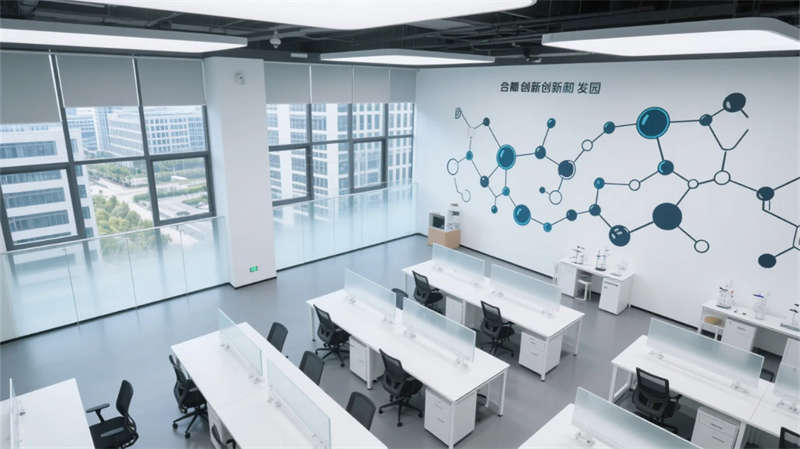 物流中庭的挑空設(shè)計(jì)打破廠房尺度壓迫感,懸掛式數(shù)據(jù)看板如抽象藝術(shù)品,與玻璃穹頂投下的天光共構(gòu)科技禪意。研發(fā)區(qū)可移動實(shí)驗(yàn)裝置墻體現(xiàn)柔性生產(chǎn)理念,分子結(jié)構(gòu)藝術(shù)墻繪暗喻制造背后的科學(xué)探索。