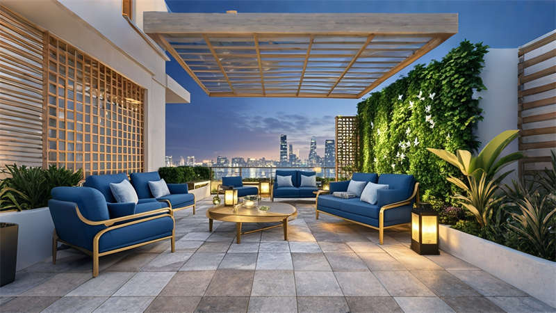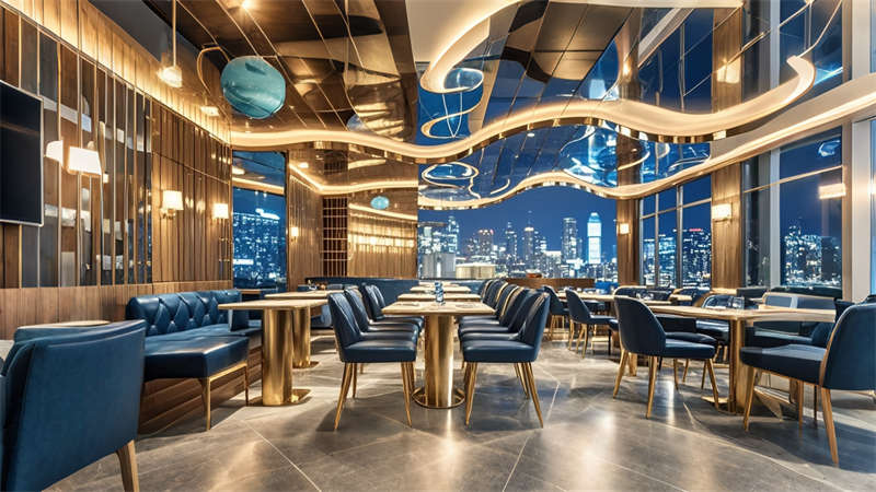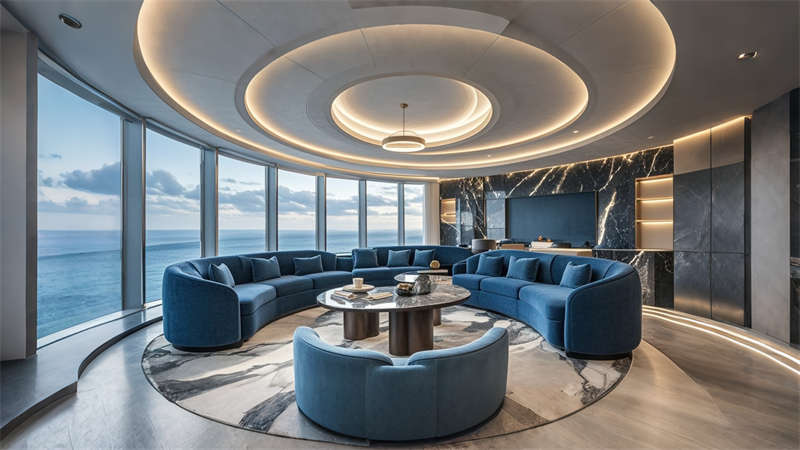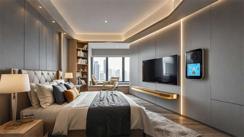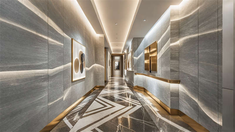 色彩體系以香檳金與深海藍為主調(diào),大堂采用香檳金金屬線條勾勒建筑肌理,搭配深海藍大理石營造視覺重心??头繀^(qū)運用暖灰硬包墻面平衡色彩強度,通過2700K暖光與4000K中性光分區(qū)照明塑造晝夜場景。材質(zhì)組合注重層次:大理石地面、金屬構(gòu)件、絨布軟包形成質(zhì)感三部曲。