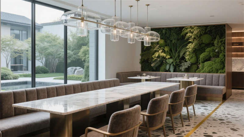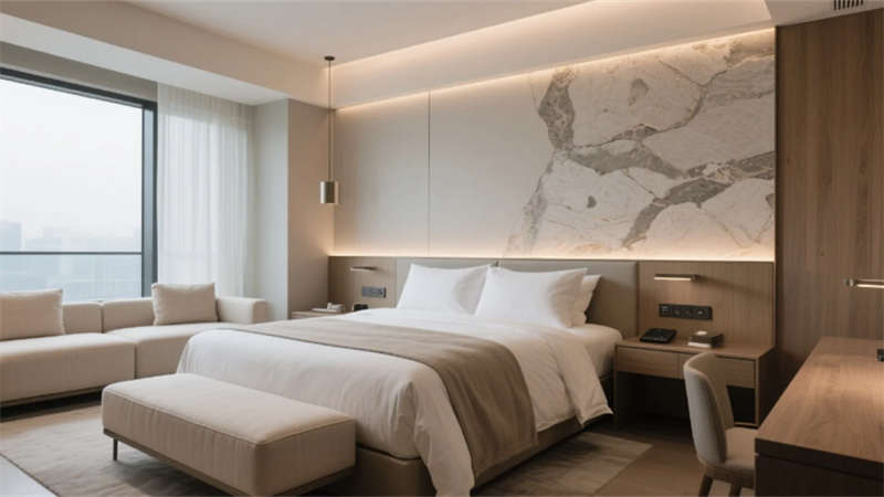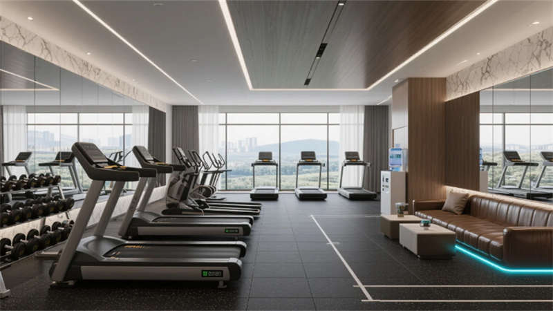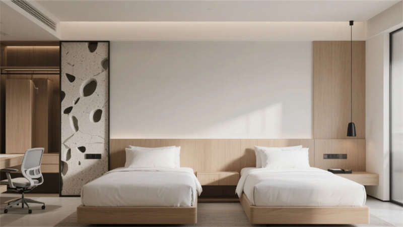 客房以中性色調(diào)為基底,亞麻、柚木與肌理墻面營造松弛感,智能化系統(tǒng)隱于無形,從電動紗簾到無線充電桌,細(xì)節(jié)中滲透科技溫度。雙床房的可移動屏風(fēng)與定制家具,兼顧私密與靈活;衛(wèi)浴空間以霧面玻璃與水磨石打造朦朧質(zhì)感,啞光五金件點(diǎn)綴現(xiàn)代精致。餐廳以共享長桌與綠植墻激活社交氛圍,水磨石地面鑲嵌的黃銅線條如溪流蜿蜒,呼應(yīng)徽派建筑中的流水意象。健身房鏡面與橡膠地面反射城市燈火,休憩區(qū)的皮質(zhì)軟榻與漸變燈光,為運(yùn)動后提供片刻寧靜。