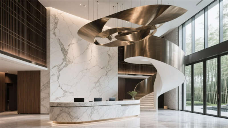 這座酒店以自然與人文的共生為靈感,將徽州山水意境凝練于現(xiàn)代設(shè)計(jì)語言中。建筑外觀以幾何切割的洞石立面與通透玻璃幕墻交織,垂直綠植如水墨筆觸般攀附墻體,入口處鏡面水景倒映天光云影,模糊建筑與自然的邊界。步入大堂,挑高空間內(nèi)懸浮的螺旋樓梯與抽象金屬裝置形成動態(tài)視覺焦點(diǎn),暖木格柵與冷冽大理石碰撞出靜謐與奢華的平衡,全景窗將庭院竹林景觀引入室內(nèi),光影隨時間流轉(zhuǎn)而變幻。