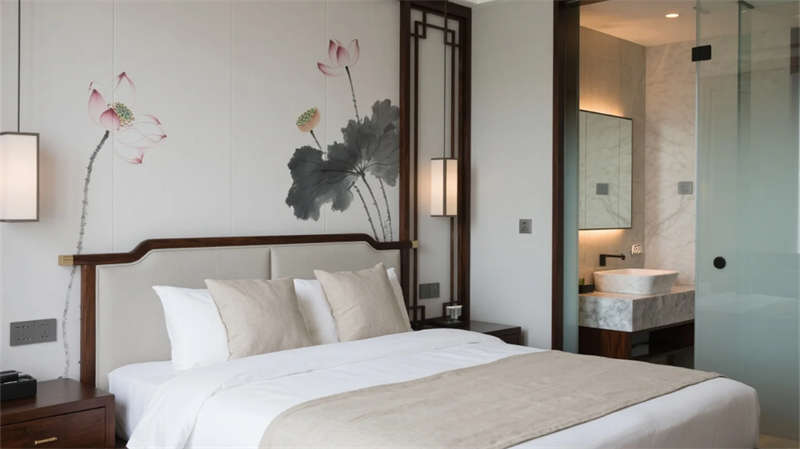 大堂以格柵天花與山水背景墻定調,光影交錯間傳遞寧靜力量。餐廳借竹編與紙燈演繹傳統匠心,窗外庭院景觀延伸視覺層次。客房摒棄繁復裝飾,棉麻材質與低飽和度色彩引導深度放松,套房通過屏風巧妙劃分動靜區域。茶室以博古架和宣紙屏風構筑禪修意境,而庭院花園的枯山水與竹影,則成為自然與建筑的共生隱喻。