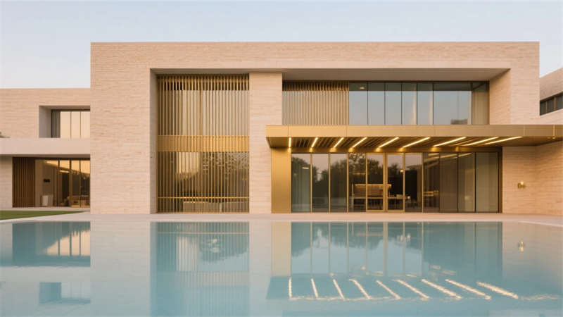 建筑外觀通過香檳金格柵與玻璃的虛實對話,成為城市界面的優(yōu)雅符號。室內(nèi)外空間流暢銜接,光影在金屬、石材與水體間自然游走,最終凝聚成兼具現(xiàn)代鋒芒與人文溫度的都市謐境,為賓客提供超越尋常的精神棲居。