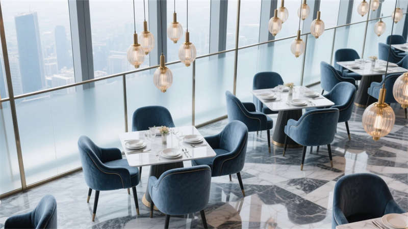 空間敘事聚焦于質(zhì)感細節(jié):皮革與絨面織物溫柔包裹休憩區(qū)域,定制吊燈灑落琥珀光暈,抽象藝術(shù)畫作點綴留白墻面。從高空餐廳的云端食趣到套房浴室的蒸汽氤氳,從大堂茶歇的咖啡香氣到泳池區(qū)的波光瀲滟,設(shè)計以人性化尺度打造多重感官體驗。