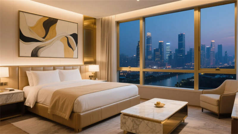 酒店以當(dāng)代輕奢美學(xué)為靈魂,將精致質(zhì)感融入每個空間肌理。淺金色金屬與溫潤大理石的碰撞,勾勒出低調(diào)奢華的氣質(zhì)基底,暖灰中性色調(diào)營造舒緩靜謐的氛圍場域。落地玻璃幕墻引自然入室,琥珀色玻璃屏風(fēng)與鎏金藝術(shù)裝置在光影交織中煥發(fā)靈動生機。