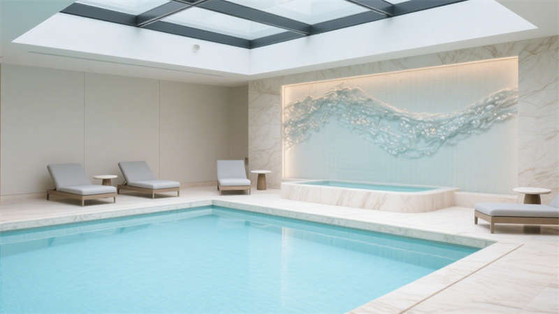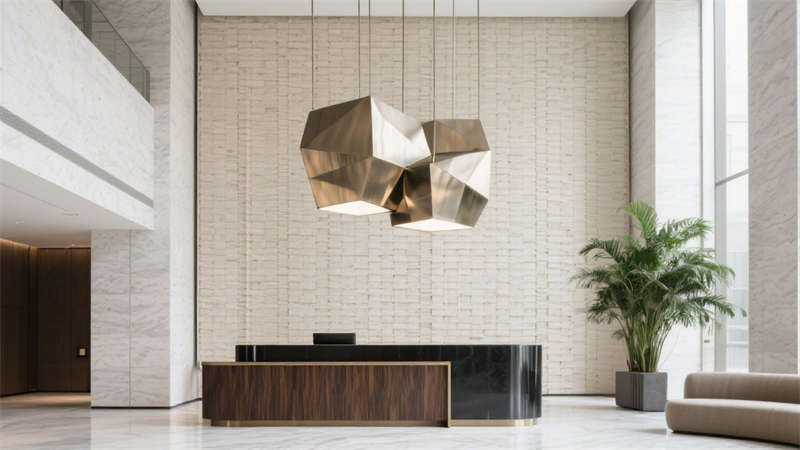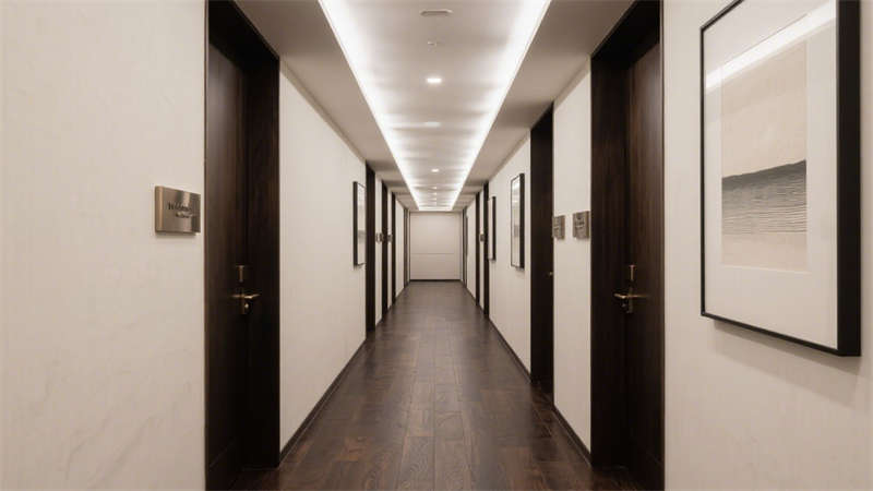 在公共區(qū)域,大堂以開闊通透的布局呈現(xiàn),大面積的落地玻璃引入充足自然光線,讓空間更顯明亮通透。接待區(qū)選用柔軟的布藝沙發(fā)與金屬質(zhì)感的裝飾擺件相搭配,既傳遞出溫馨的氛圍,又不失精致格調(diào)。走廊設(shè)計則注重引導(dǎo)性,墻面采用肌理感材質(zhì),搭配嵌入式燈光,營造出靜謐而優(yōu)雅的行走體驗。