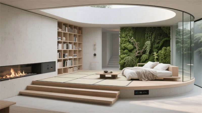 客房以極簡的智慧回應棲居本質。榻榻米地臺消弭床與地面的界限,270°環景霧化玻璃輕觸即透,仿生綠植在智能光影中呼吸生長,隱藏式投影幕布落下時,星空與林海皆成私享背景。階梯書吧的垂直綠植墻下,模塊化沙發隨需求自由組合,全息粒子在空氣中勾勒出流動的藝術,而巖板中島餐廳里,藤編座椅與吊燈矩陣的光暈交織,智能調光天窗讓每一餐都浸染著天光的溫度。