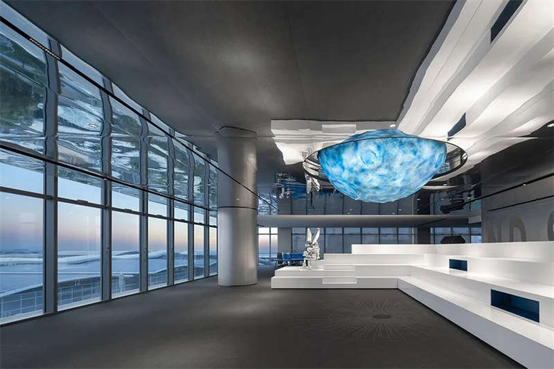 白色臺階半圍合而成的區(qū)域,擁有絕佳的風(fēng)景,設(shè)計(jì)充分挖掘功能的實(shí)用性,帶有視覺沖擊力的隕石吊燈和Robbie兔,讓這里具備了舞臺的屬性,成為具有強(qiáng)交互感的沙龍區(qū)。