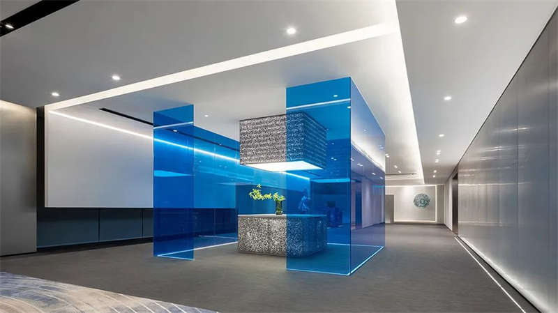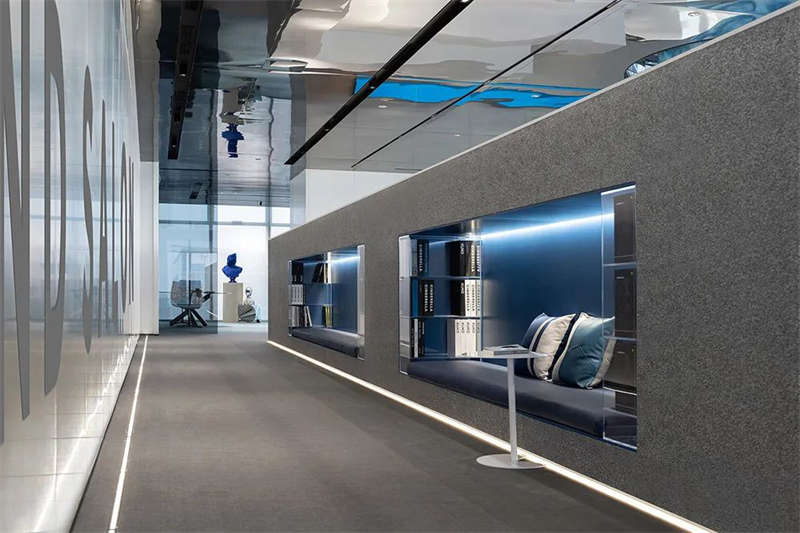 設(shè)計(jì)師在灰調(diào)的空間中,注入純凈的克萊因藍(lán),高飽和度的單純色彩具有神奇的魔力,讓人們在強(qiáng)烈的視覺沖擊下迷失感官,與室外的海天融通一體,達(dá)致沒有感官桎梏的心靈自由;灰色則讓空間保有充裕的從容,以及留白的呼吸感。以此實(shí)踐在物質(zhì)之上,具有純粹精神的空間情景。
