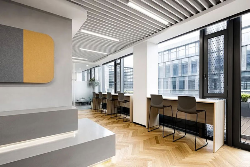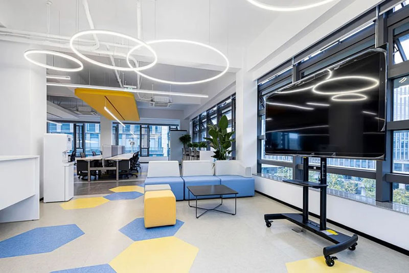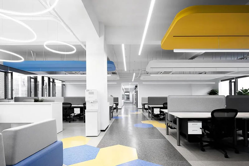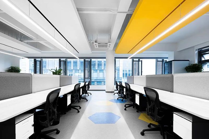 開放工位的造型吊頂與地面色塊相互呼應,輕松有趣的氣質穿梭在人員協作之間,中性色彩辦公家具在細節上增加耐用和降低視覺刺激導致的疲勞感。真正舒適的空間做到與功能需求一致,提供給使用者專心的設施和敏捷的思路。