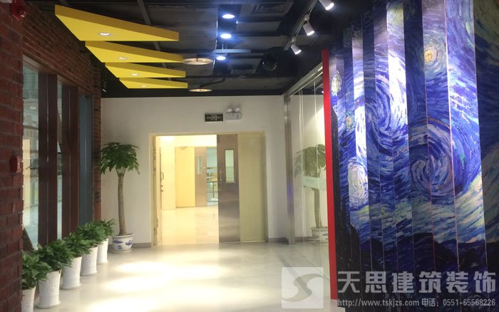 以下圖片,節選自待完工的工地現場,分別是入口、大廳、過道、教室、活動中心等功能區域。整體選擇LOFT混搭風格,裸露的天花板+墻面,搭配現代元素,既節省了裝修成本,也營造了“藝術人生”的環境。