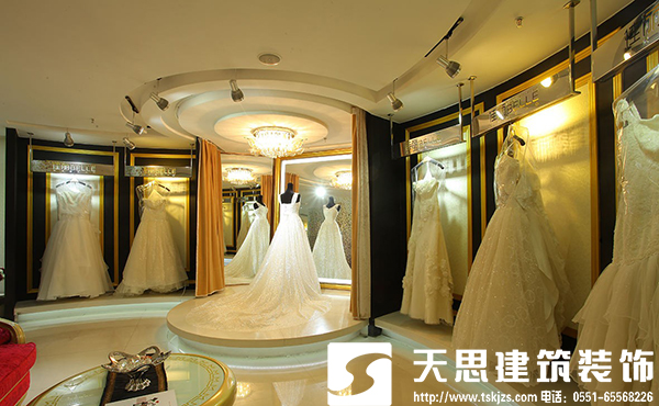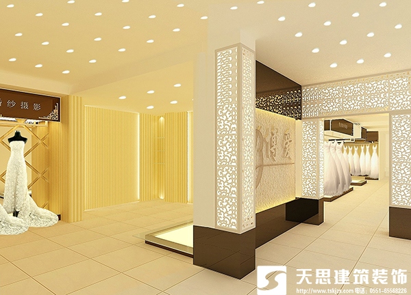 燈光要和色彩的完美的配合,要烘托出一種溫馨浪漫的氛圍。在裝修中大廳燈光的運用首先考慮色溫,一般在2700K的色溫為宜。但局部需要突出產品的還需要用冷光源,例如直射婚紗的光源要用冷光,這樣能感受到婚紗的清潔、明亮、白、艷。
