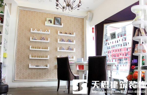 合肥天思裝飾提醒大家在這個追求美和健康環保的年代美甲店的室內光線應該充足,白天盡量采用自然光,選用落地玻璃窗能夠有效的利用自然光,讓室內能有很好地采光性。在燈光的選擇上,以溫馨為主,能夠讓顧客在享受服務時放松身心,而光線的層次感,能夠讓顧客置身于愉悅輕松的氛圍中,更好地襯托出美甲的效果來。