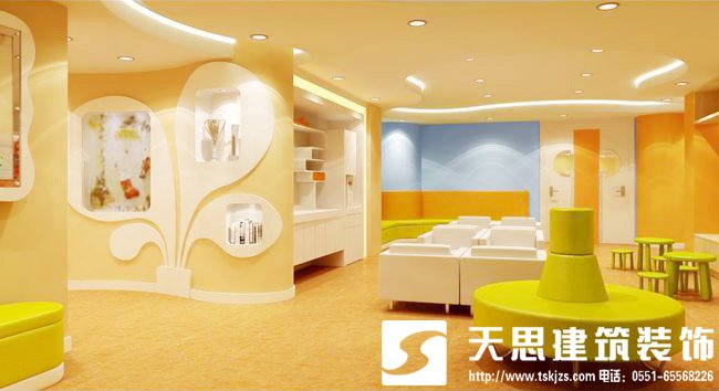 在幼兒園裝修中,一般情況下,幼兒園室內高度以3.2-4米為宜。否則太低會令幼兒產生壓抑、緊張感;過高則讓幼兒感到缺乏溫馨、親切的氛圍。因此,樓層的高低宜在建筑設計時給予充分考慮??紤]到目前部分幼兒園的室內空間不符合標準,如果是過高的空間,可考慮頂面裝修或懸吊一些裝飾物,以降低其空間,改變視覺上的空曠感。