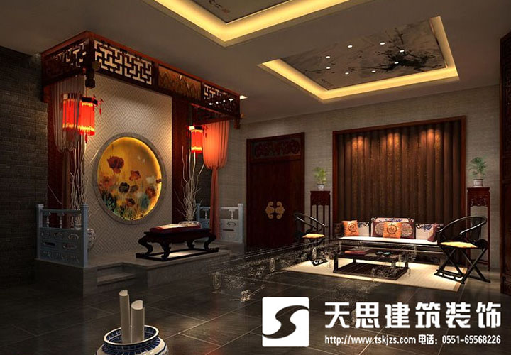 私人會(huì)所中式裝修,內(nèi)部設(shè)置裝飾要與來(lái)此常聚的人們脾性喜好相適應(yīng).在客廳設(shè)計(jì)中,頂部采用木雕邊框,中間彩繪的小方塊組成了一幅好看的圖案.六角宮燈的紅色光暈散發(fā)出點(diǎn)點(diǎn)浪漫和溫馨,裝飾著整個(gè)淡雅的空間.