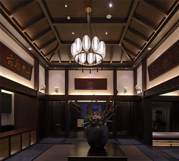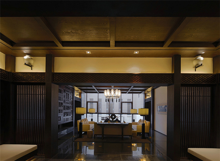 穿過悠長的走道,在灰白色空間配合溫暖沉著木色格子窗棱,讓客人逐步感受一種優雅的熱情。天花的黑色線條設計,帶有極強的導向性,墻面上特別設計的壁燈,與柱體結合,極大地豐富整個空間的層次感和趣味性。