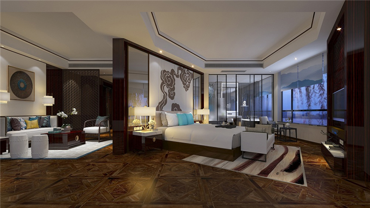此次精品酒店是結(jié)合古典與時(shí)尚的設(shè)計(jì)典范,充分融合了地域的歷史文化因素。酒店以商周時(shí)期為歷史背景,設(shè)計(jì)師提煉出古蜀文化簡(jiǎn)潔、淳樸的風(fēng)格內(nèi)涵,采用整塊毛石作為大廳服務(wù)臺(tái),體現(xiàn)原始、粗獷的意境,通過(guò)書(shū)法和壁畫(huà)的描繪,展現(xiàn)古代川西平原繁榮昌盛的景象。
