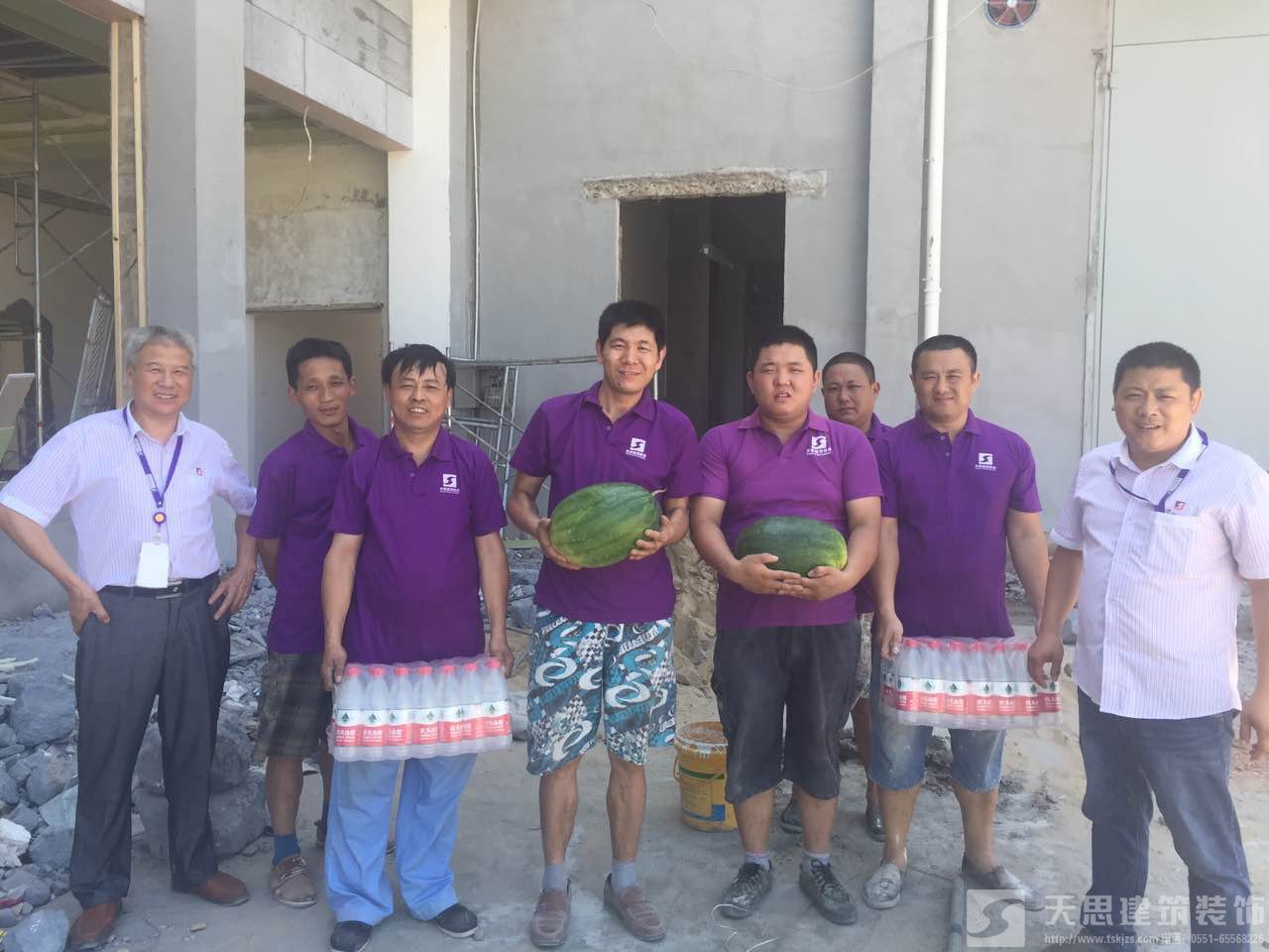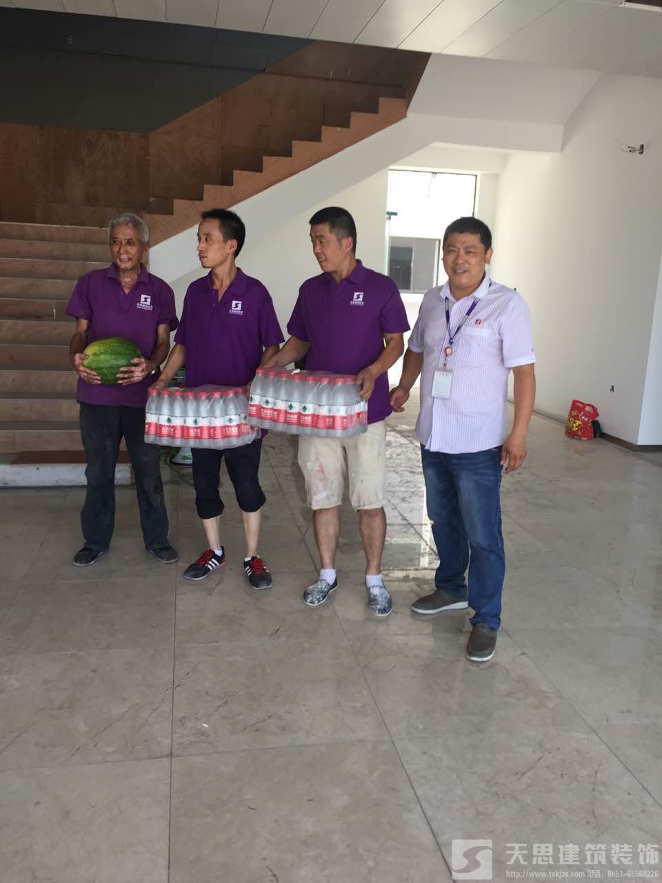 天思建筑裝飾公司為工作在第一線的天思項(xiàng)目經(jīng)理及工人送一點(diǎn)點(diǎn)小小的慰問品,謝謝你們的付出,你們辛苦了。天思一行對大家為趕工期、保質(zhì)量所付出的辛苦表示衷心感謝,并囑咐工地負(fù)責(zé)人要愛護(hù)裝修工人的身體,在保質(zhì)量為首要前提下抓好安全施工。施工盡量利用早、晚時間,盡量避開高溫時段;若發(fā)現(xiàn)有身體不適,要及時注意休息,情況嚴(yán)重的要及時送醫(yī)。