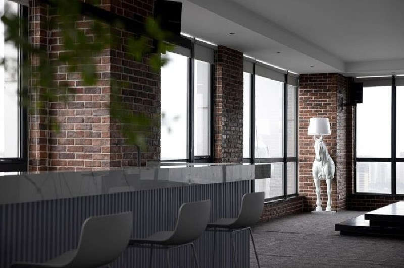 經(jīng)劃分,原本四方的整體空間,大致可歸為公共辦公區(qū)、獨立辦公室、黨建室、互動區(qū)、財務(wù)室、會議室、儲藏室、休閑室、檔案室及其他功能區(qū)域。拋去濃烈的墨黑,以灰、白作主色調(diào),既保持了沉穩(wěn)、大氣的理智感,又不使氣氛過于肅靜。前臺加入金色提亮,搭配大理石的紋理質(zhì)感,活波間亦不落俗,凈土之上雅致盡顯。在簡約現(xiàn)代的輕工業(yè)氛圍下,色彩、裝飾往往點到為止。紅磚墻與藤編椅的原生感,質(zhì)樸、不造作,在一片素雅的環(huán)境中,如曇花輕綻,為空間注入悄無聲息的生命力。