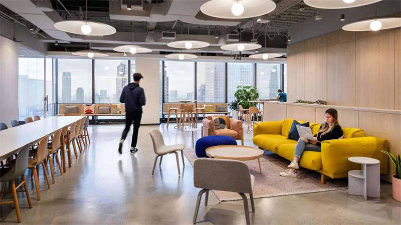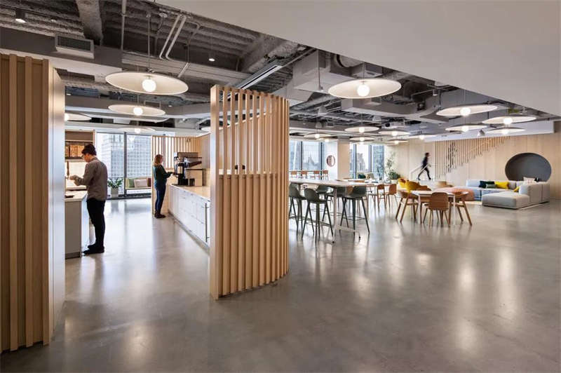超大的開放式工作區(qū),其間穿插點(diǎn)綴著各式協(xié)作空間——從會(huì)議室到電話亭應(yīng)有盡有。兩個(gè)樓層都在建筑西側(cè)規(guī)劃了大而開敞的公共區(qū)域,這里享有廣闊的城市景觀視野和充足的日光,并通過一座木制樓梯上下緊密連接。