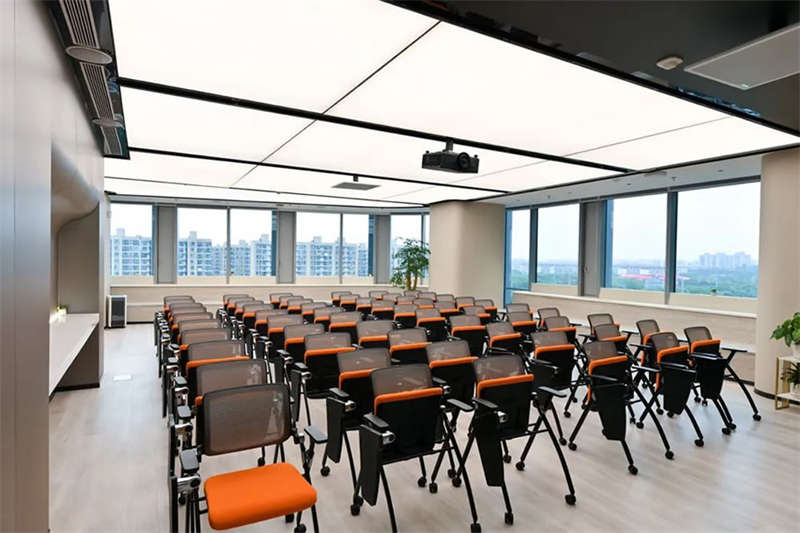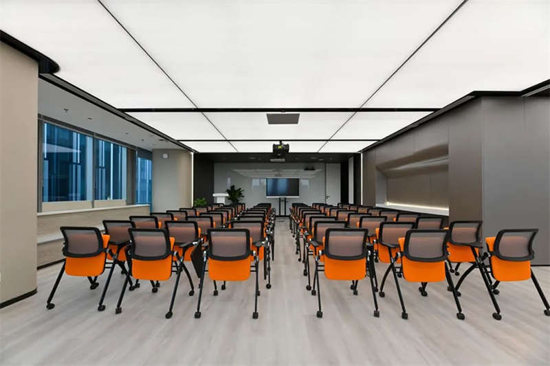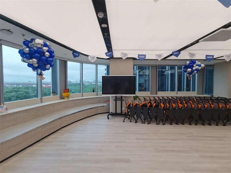 設計團隊特意選擇了一處大型開敞的臨窗場地,在酷炫的3D裸眼展示室旁邊打造出了一個4S店風格的培訓和茶水的二合一空間,以滿足客戶快速發展的團隊培訓和新品發布的需求。在臨幕墻的位置,設計師原來就設計了一排沿窗的休閑階梯造型臺階,后來因為疫情防控的需求,把臺階內的空間利用好,平時內部可以儲藏睡袋,防疫物資,帳篷等物品。