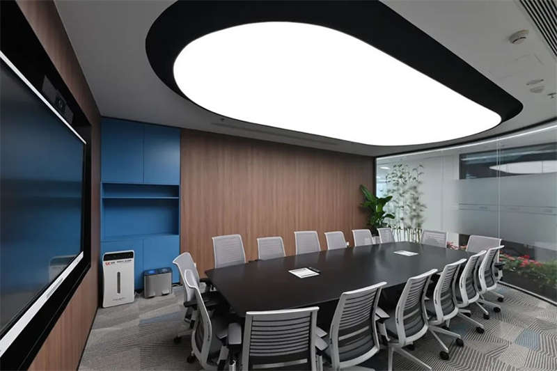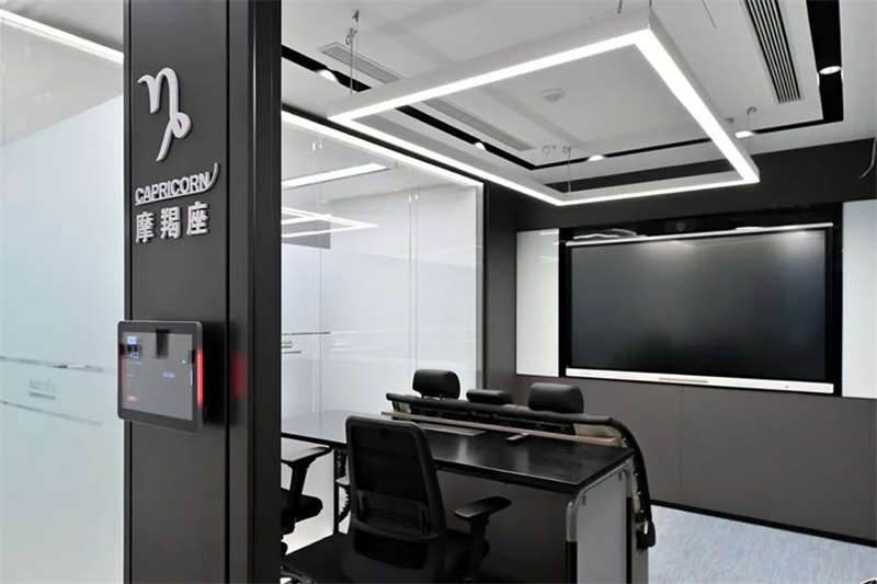 在接待前廳左右兩邊各設置了一個大會議室,其中一個是現代酷灰的可二合一的會議室,另一個是穩重優雅的行政會議室。感謝成品隔斷供應商卡萊斯卓的緊密配合和支持,在設計師的要求下,把LED燈帶嵌入了雙層玻璃隔斷中。讓整個會議室區域看上去充滿科技感!