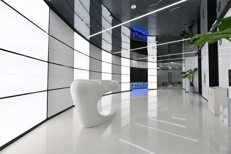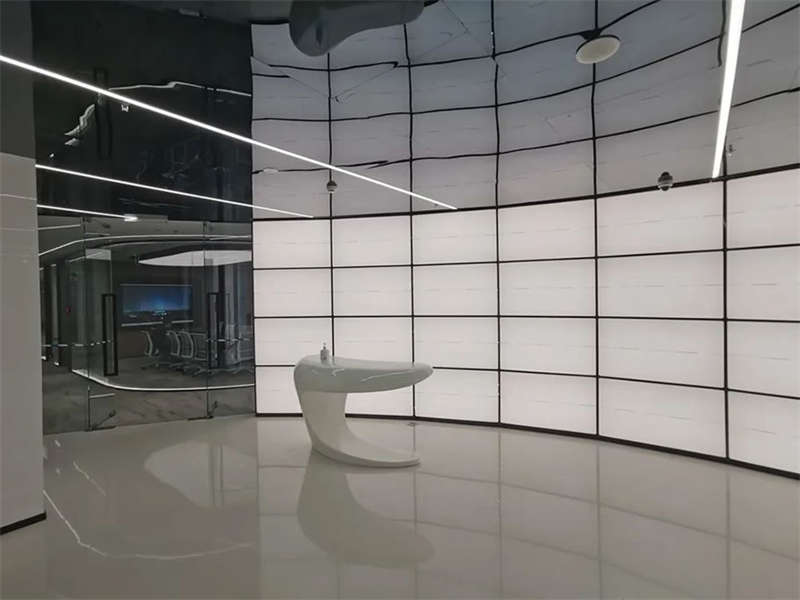 在電梯出來,一步入半圓弧的接待前廳,馬上看到的是以安全氣囊元素為主創意的,帶燈光變化的半弧造型墻,時尚大氣。在這純粹的黑白灰空間里,一個純白色飛馳動感造型的前臺安安靜靜的擺設在那,在不使用的時候,它也是一個時尚的藝術品。和背鏡墻相結合,體現了速度與安全的設計理念。