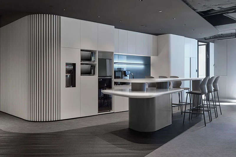 由于建筑不是專業(yè)寫字樓,全開放的租賃面積、過大的柱體、凌亂的工業(yè)管道天花也給設計提出了難題。為了平衡好行政辦公和會客及不同部門之間的功能分區(qū),設計師把打印、咖啡、小洽談休憩空間作為功能島置入整層的正中,合理分隔東西兩個工區(qū)并方便大家便捷使用。沿窗的柱體通過裝飾面的包裹和扭轉形成空間亮點,輔以休閑家具,簡短的洽談分享、小的會議討論在此得以解決,員工在介于室內空間和自然窗光中獲得了獨特的體驗和助益。