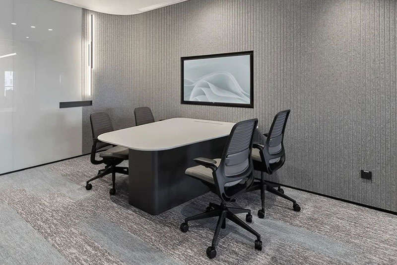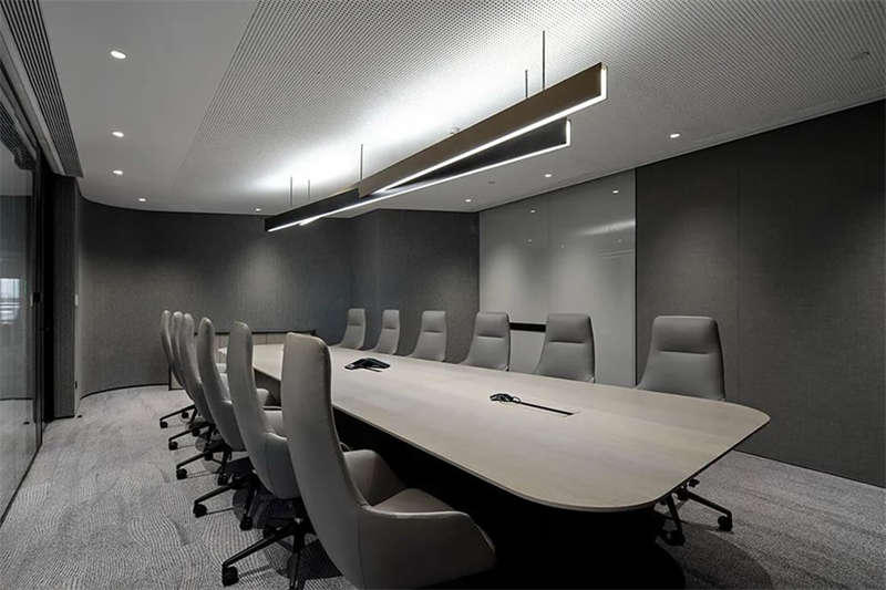 進入會議空間,設計師刻意控制它的視覺張力,前區(qū)的體驗得以延續(xù),灰黑色調覆蓋目力所及并引入更多的柔性材料,專業(yè)、專注是會議空間的功能立本但也不乏我們對活力元素的照拂,每一個會議室我們都選擇了形式各樣的藍色地毯來裝點。