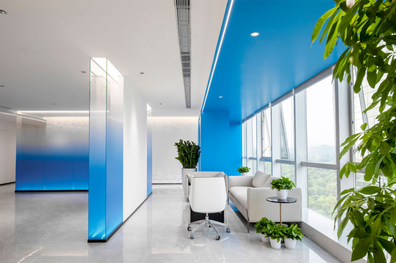 藍色散發(fā)出理性、包容與思考,暗含著公司對品質的追求,將公司的“創(chuàng)新、科技、便捷”的理念流露在空間之中。