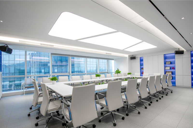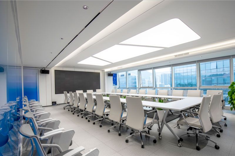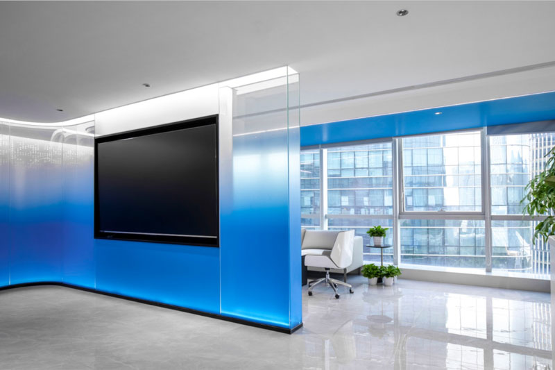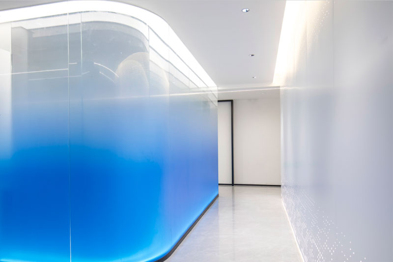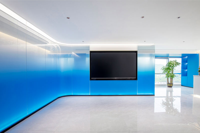 大小會議室都延續(xù)了空間的藍色基調,利用通透的藍色玻璃分隔過道,使空間更加通透明亮,不僅讓視感增強,也深刻的加強了品牌形象在訪客心中的作用。