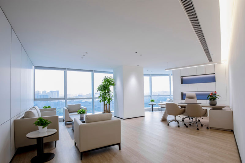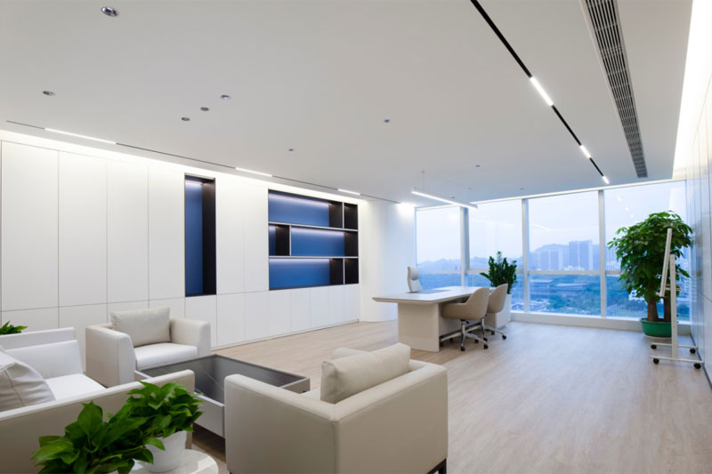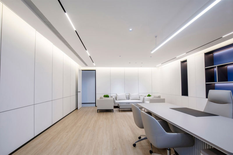 總裁辦整體空間體塊分明,大面積的木飾面體現(xiàn)出品質和細節(jié),藍白的色調與空間功能的巧妙搭配,輕盈的空間蕩漾著優(yōu)美的旋律感。