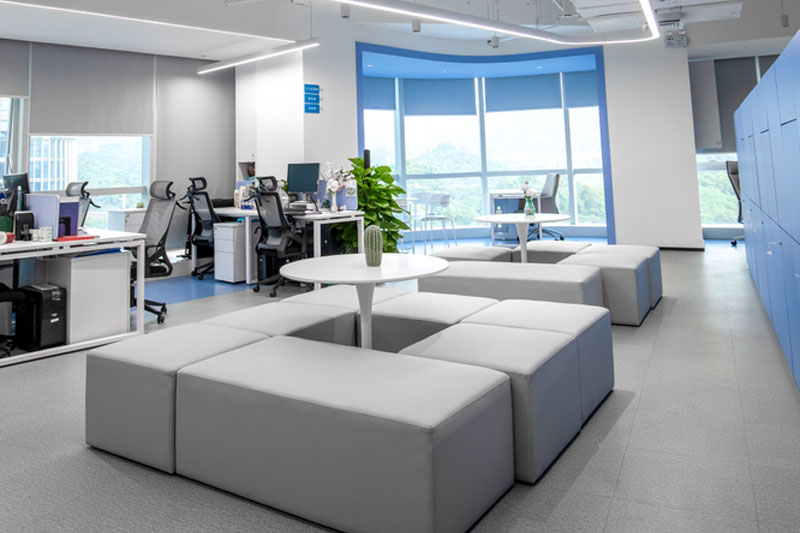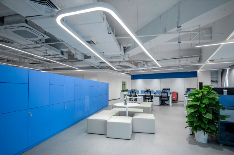 為了體現(xiàn)客戶的品牌形象和影響力,設計師將“創(chuàng)新、科技、便捷”的理念融入到空間的每個環(huán)節(jié),從企業(yè)的VI色中提取出藍色運用到整體空間中。