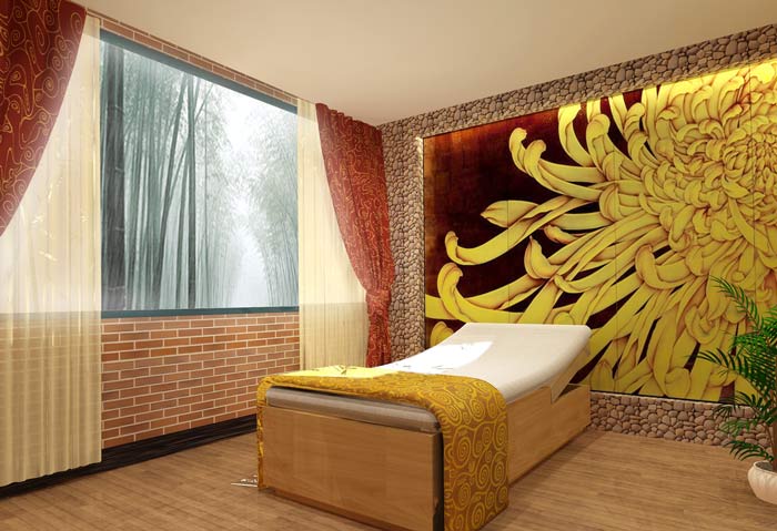 設計師在養生會所裝修設計的時候,根據業主的要求,打造一個心靈舒緩和釋放靈魂的自然氛圍養生會所。運用了意境休閑以及絕對放松的自然氛圍,再加入富有時代氣息現代簡潔的生活要求所輝映的相融合。步移景異,曲徑通幽的格局布置,使空間更為靈動,從而達到使人充分融入放松環境,忘卻塵世的紛擾。自然氛圍養生會所裝修設計的色彩運用上,基本的遵循傳統上的色彩氛圍上,以褐色,金色,紅色為主色調,讓客人在享受服務的同時有更多層次的感受。