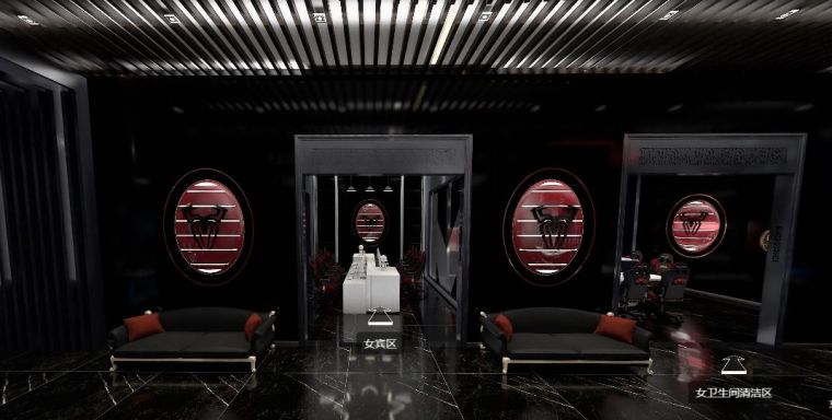 在迎賓區兩邊,左右分布著男賓區和女賓區。相較于普通網咖設計,電競會館具有賽事承辦上的專業特色,為了使人更加有比賽所需專注,男賓區墻面只有簡單的涂鴉,飾物元素也極少,相較于男賓區設計較為簡單,女賓區“紅蜘蛛”主題感十足,頂墻燈光合理搭配來減少黑色來的的壓抑感。男女獨立衛生間分別分布在兩個區域,非常人性化。