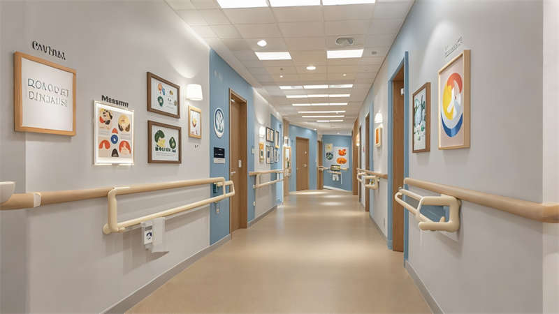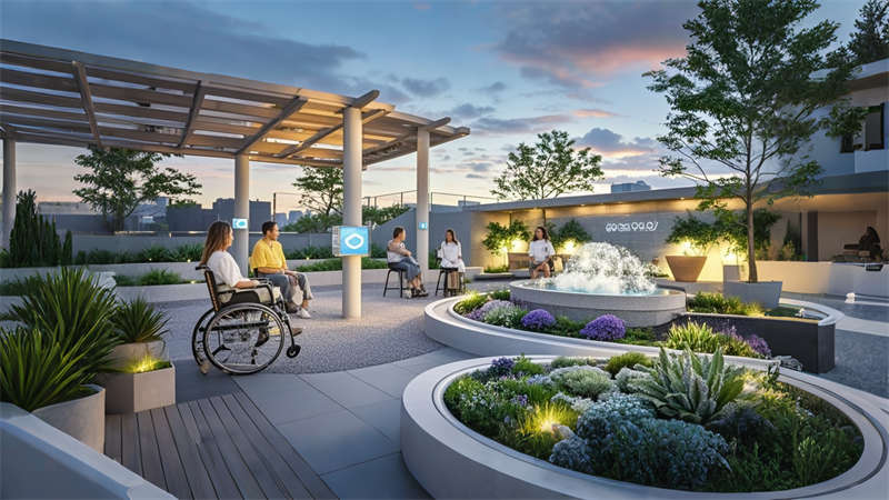重點區(qū)域采用防滑橡膠地板、圓角處理家具、緊急呼叫裝置等 35 項適老細(xì)節(jié),照明系統(tǒng)采用 4000K 暖白光搭配智能調(diào)光。醫(yī)療區(qū)設(shè)置獨立新風(fēng)機(jī)房,活動區(qū)配置體感互動設(shè)備,戶外花園集成霧森降溫和夜光導(dǎo)航系統(tǒng),打造安全、舒適、智能的現(xiàn)代養(yǎng)老空間。
